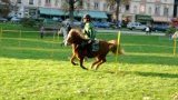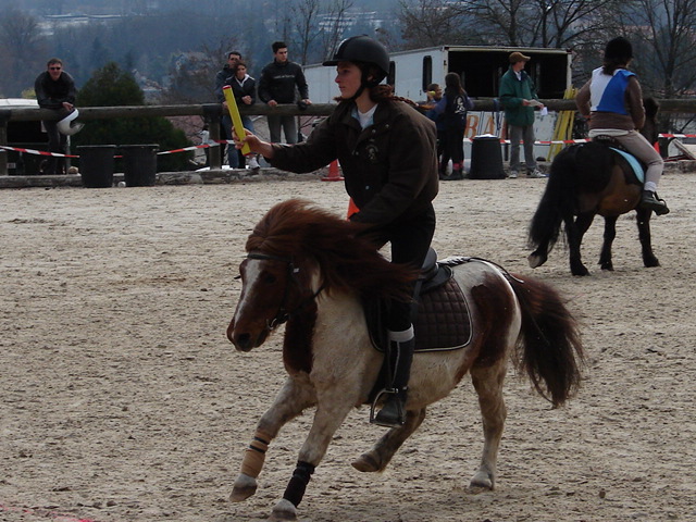 Au signal du départ, le cavalier n° 1, tenant un témoin, slalome autour des piquets à l’aller et au retour et, ayant franchi entièrement la ligne d’arrivée, transmet le témoin au cavalier n° 2.