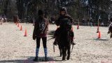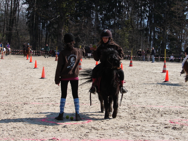 Le cavalier N°1 s’élance, prend la balle que lui tend la personne au fond du terrain et, au retour, la pose sur le cône de son choix .